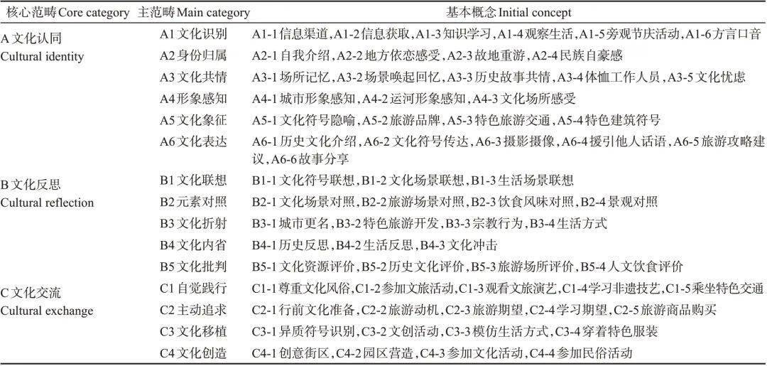 通过第一轮编码得到的64个基本概念可知,在旅游活动中,旅游者对大运河文化的感知与旅游活动场景关联密切,感知的过程通过评价、对比、回忆、联想和学习等行为活动来实现。通过主轴编码和选择性编码,得到概括程度更高的15个主范畴和3个核心概念。家国情怀是一种对家园故土依恋的公共意识 [66],在国内旅游活动中,旅游者的家国情怀则是一种旅游者将个体意识寓于中华民族发展的社会意识,包含着对各种文化和旅游现象持有开放、认同、包容和感恩等态度的人文主义情怀。而从价值论角度看,文化自觉是人带有目的性的文化价值取向 [67],即在游记语境中,旅游者主动选择表达的内容是其有觉醒、认识和反思的文化内容,旅游者在游记中选择具有象征符号的事物进行阐述,表达潜藏在旅游回忆空间里的个人与国家命运的同频共振 [42]。通过游记文本可以看出,旅游者通过文化认同、文化反思和文化交流3个过程的文化自觉机制生发家国情怀情感。在游记文本中,这3个过程的概念又可折射为觉他、觉自和对话3种现象。